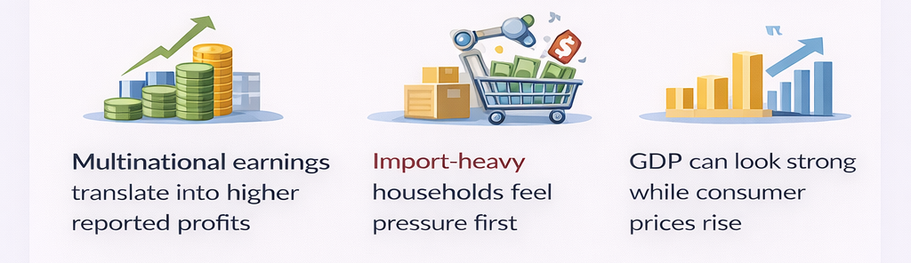 As exports and profits improve, the economy may appear strong on paper. At the same time, consumers may be paying more for imported goods and facing higher living costs.